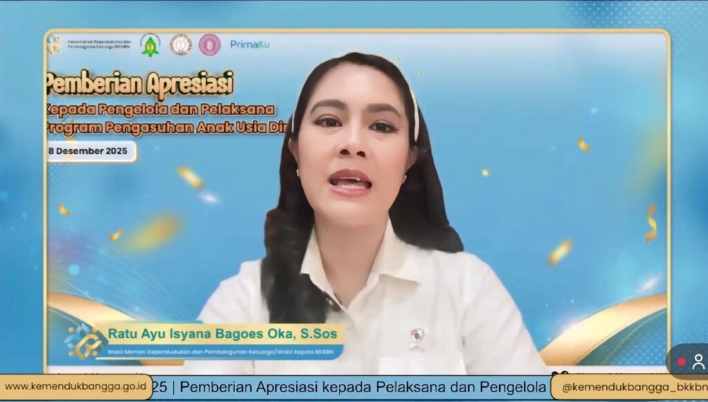 Di tengah meningkatnya tantangan pengasuhan anak usia dini akibat perubahan sosial, tekanan ekonomi, dan derasnya paparan digital, Kemendukbangga/BKKBN memperkuat ekosistem pengasuhan nasional melalui gelaran Apresiasi Program Pengasuhan Anak Usia Dini 2025 yang diselenggarakan secara hybrid di Jakarta, Senin (8/12/2025). Kegiatan ini diikuti lebih dari 1.000 peserta dari pemerintah daerah, akademisi, organisasi profesi, kader, pengasuh, serta tenaga lini lapangan dari seluruh Indonesia.